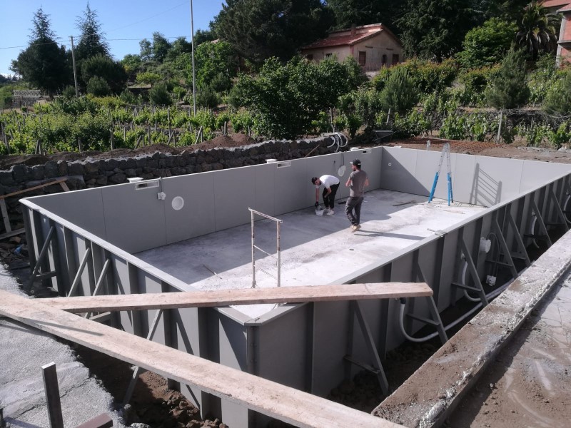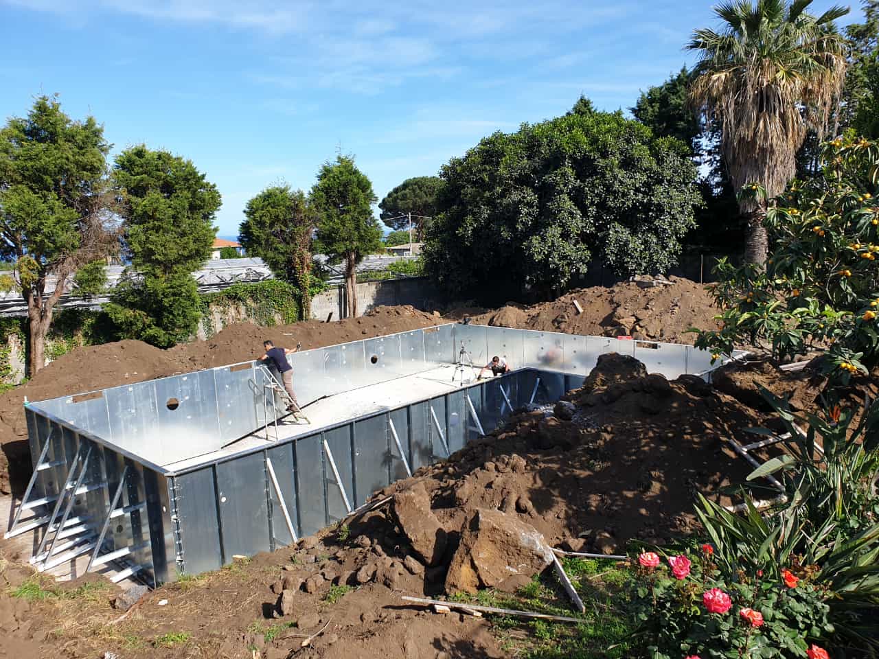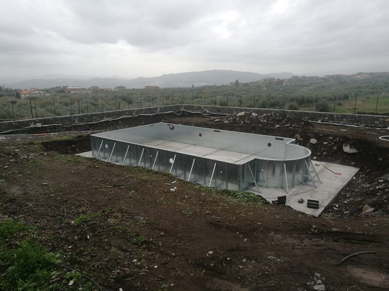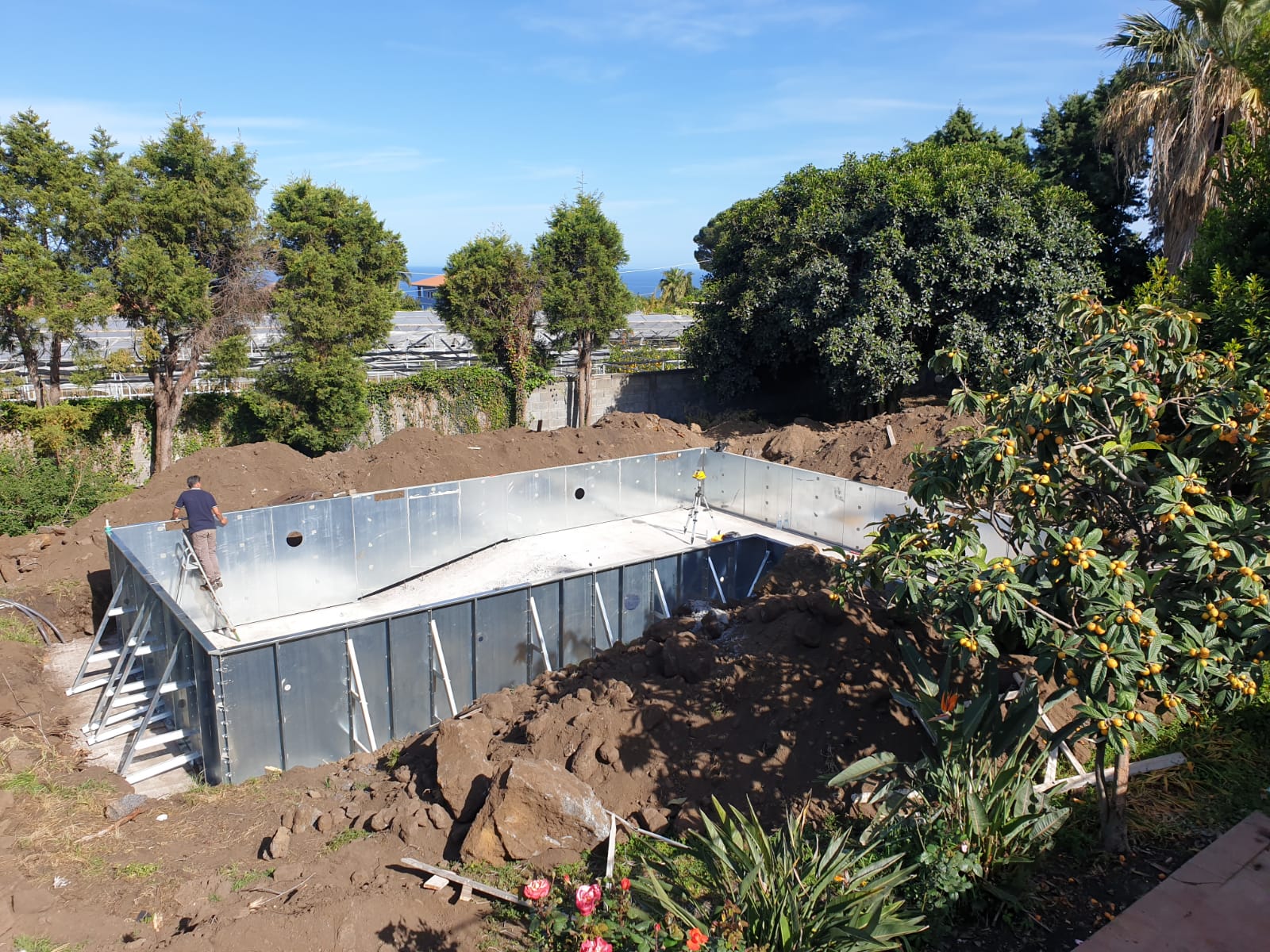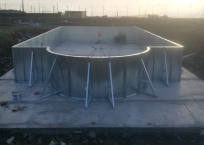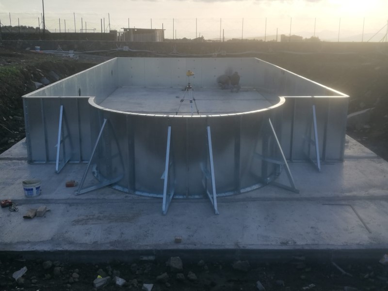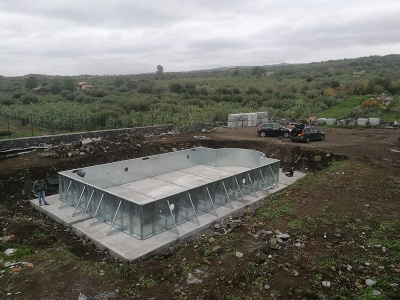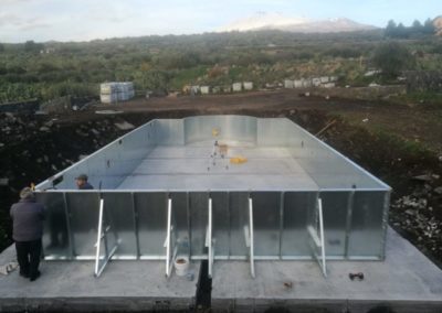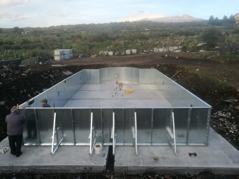 Le strutture sono composte da pannelli di acciaio zincato dello spessore di 2 mm collegati tra loro attraverso della viteria zincata e supportati lateralmente da degli speciali contrafforti triangolari che garantiscono l’equilibrio statico tra la spinta dell’acqua contenuta nella vasca e quella del terreno circostante.