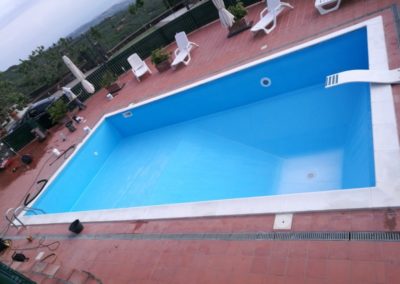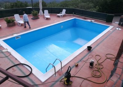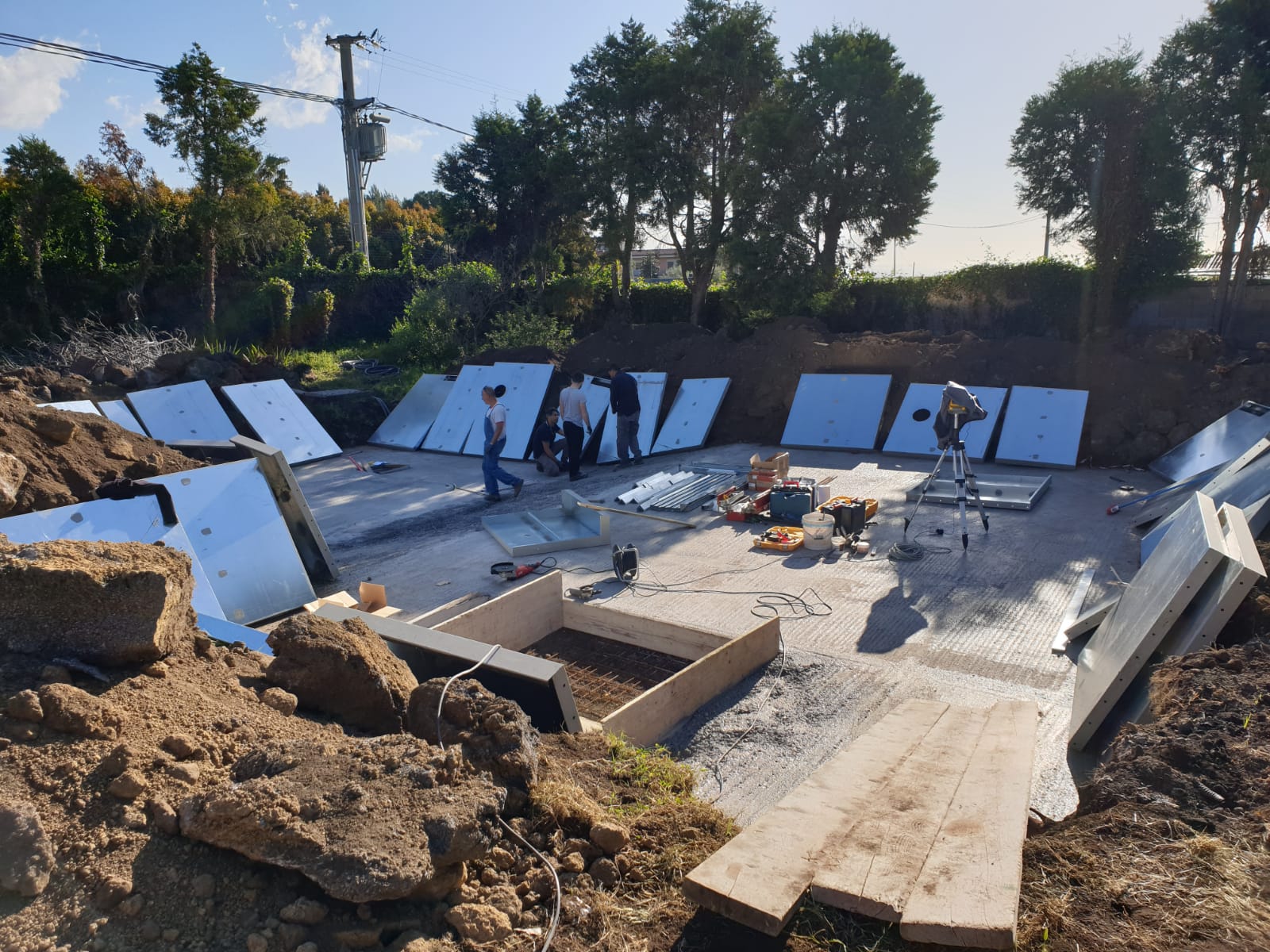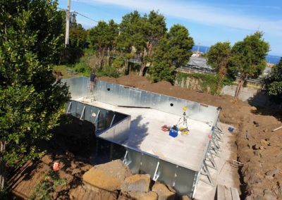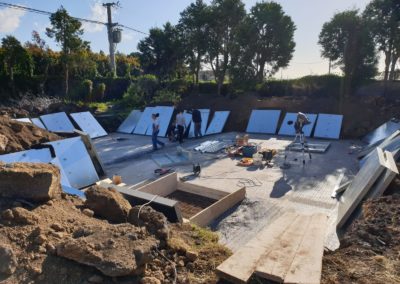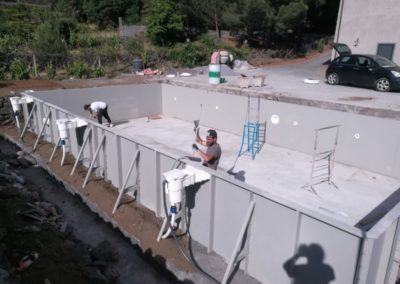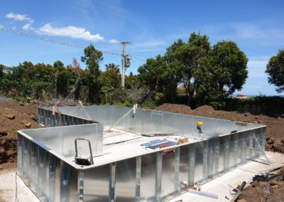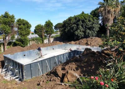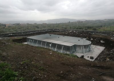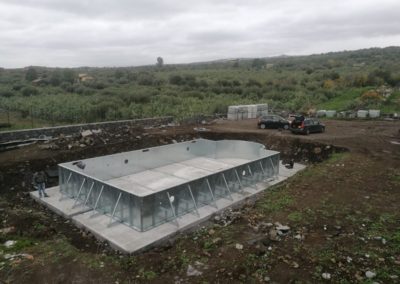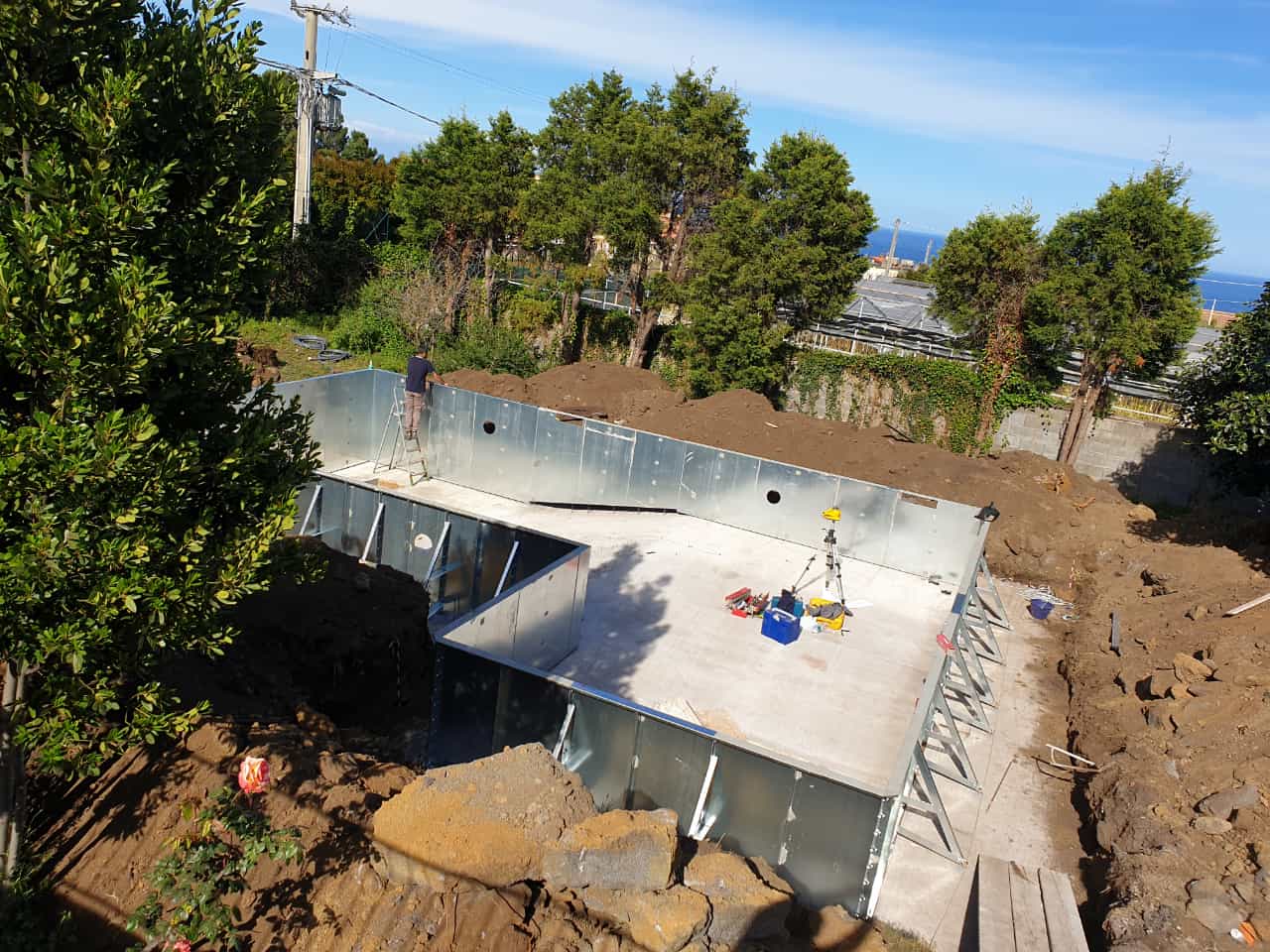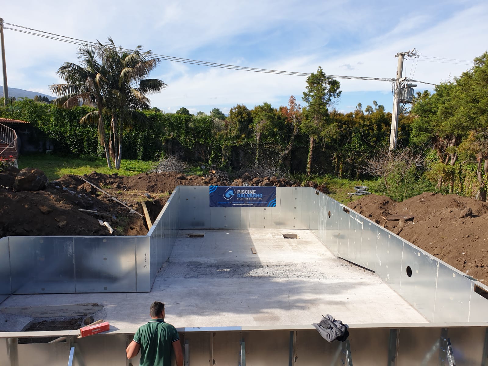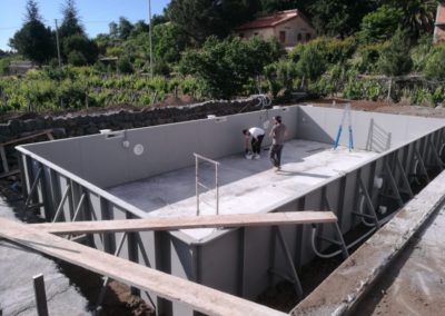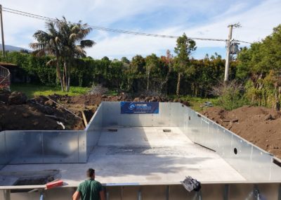 Le strutture sono composte da pannelli di acciaio zincato dello spessore di 2 mm collegati tra loro attraverso della viteria zincata e supportati lateralmente da degli speciali contrafforti triangolari che garantiscono l’equilibrio statico tra la spinta dell’acqua contenuta nella vasca e quella del terreno circostante.