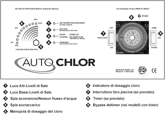 Essendo il consumo di cloro dipendente da molti fattori come temperatura dell'acqua, utilizzo della piscina, condizioni atmosferiche, ecc., non è possibile stabilire dei parametri di regolazione standard comuni a tutte le piscine. Si dovrà quindi provvedere, sulla base di letture di analisi del cloro settimanali, ad aumentarne o diminuirne la produzione agendo sulla manopola di controllo.