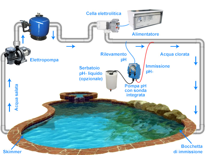 Preparare la piscina per l'utilizzo dell'elettrolisi del sale è facile: bisogna semplicemente portare il livello del sale a4.500/5.500 ppm, implementare l'unità generatrice di sale nell'impianto di filtrazione della piscina e l'unità di controllo a una distanza adeguata, impostare le ore di funzionamento desiderate, e avviare il processo di sanitizzazione.