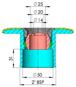 Bocchetta modello Multiflow, con Filetto esterno di 2" ed interno per incollaggio Ø 50 mm.