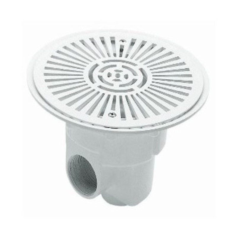 Scarico in ABS bianco con protezione contro i raggi UV, Attacco inferiore 1 1/2" e laterale 2", con aspirazione acqua della vasca in profondità.
